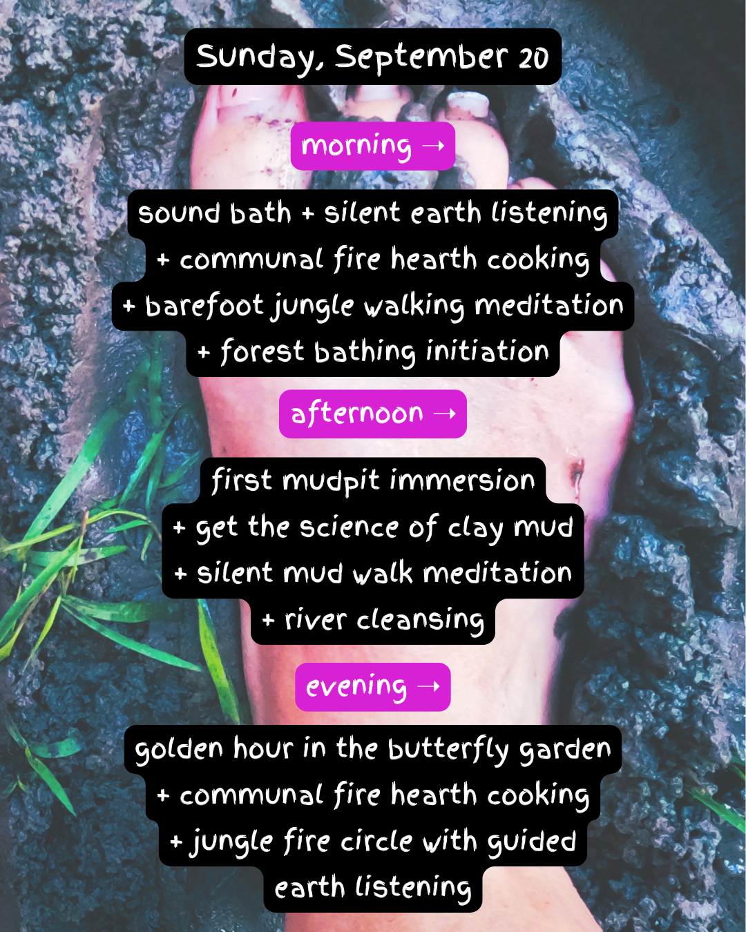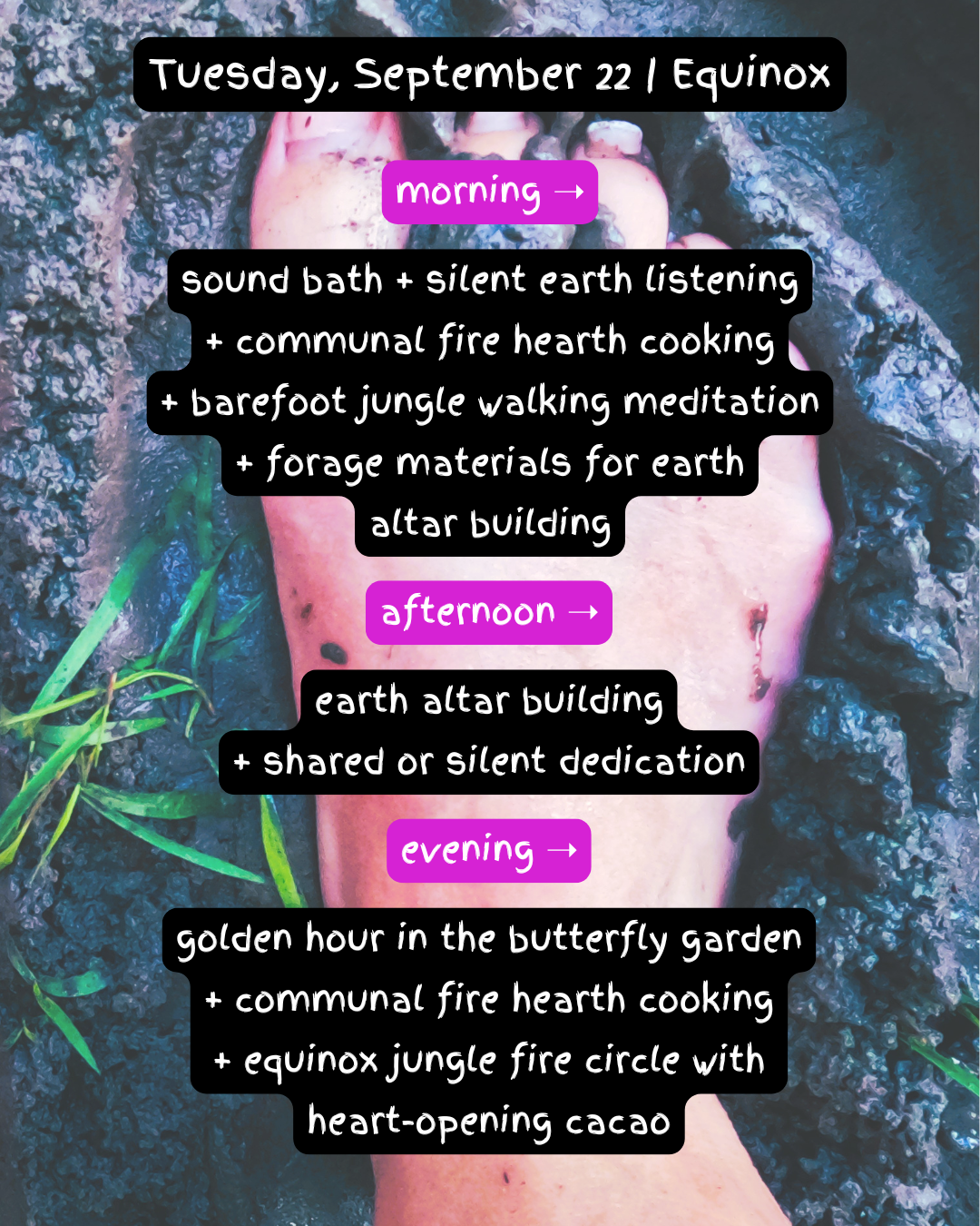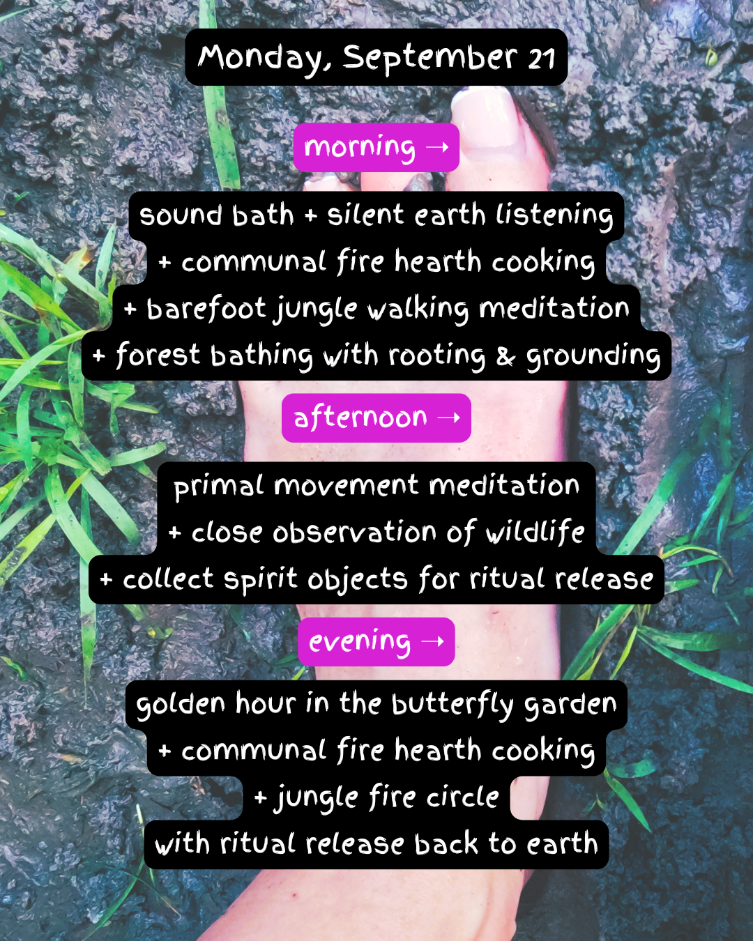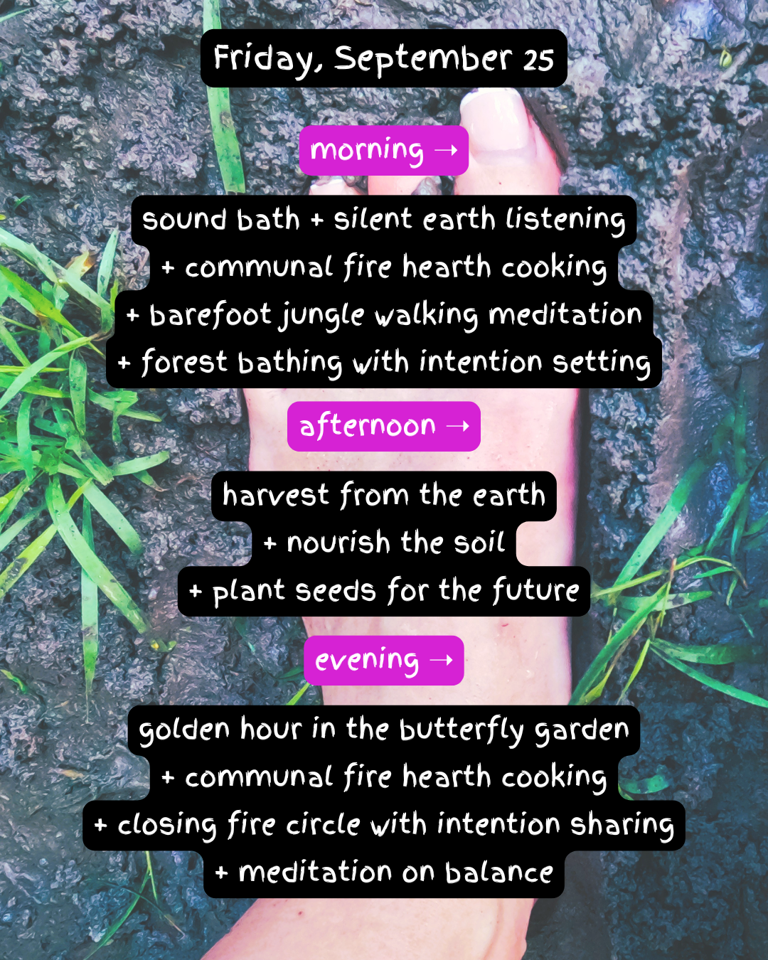 Each blessed day begins with earth listening and a sound bath for the ecofarm. The morning is grounded around communal fire hearth cooking, river swimming, and 60-90 minutes of guided forest bathing.