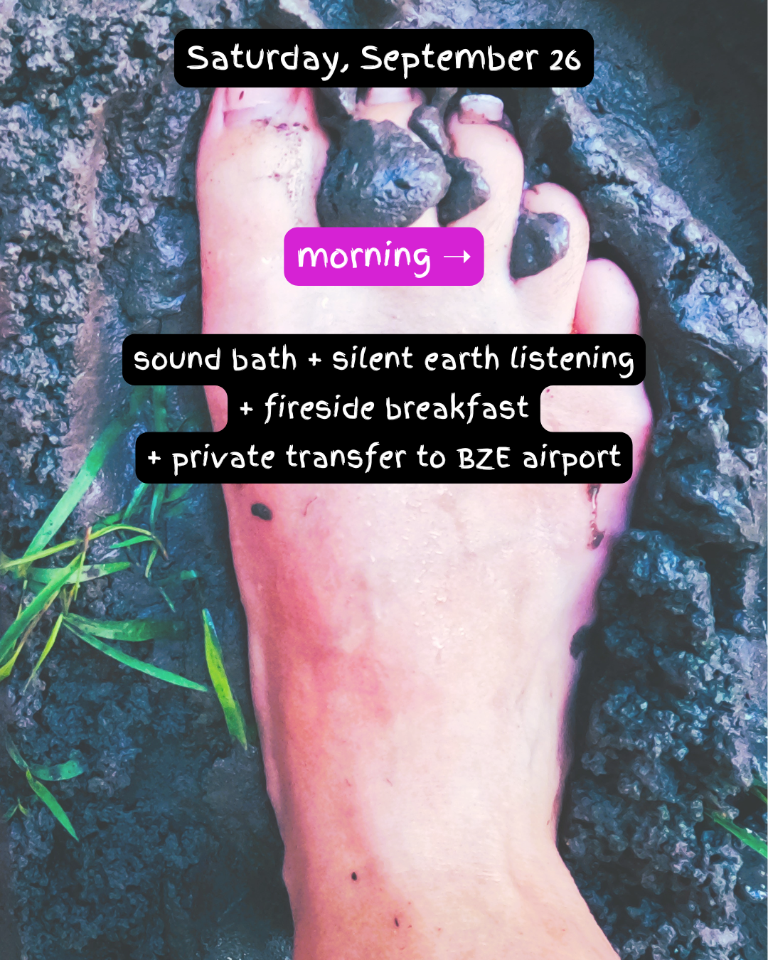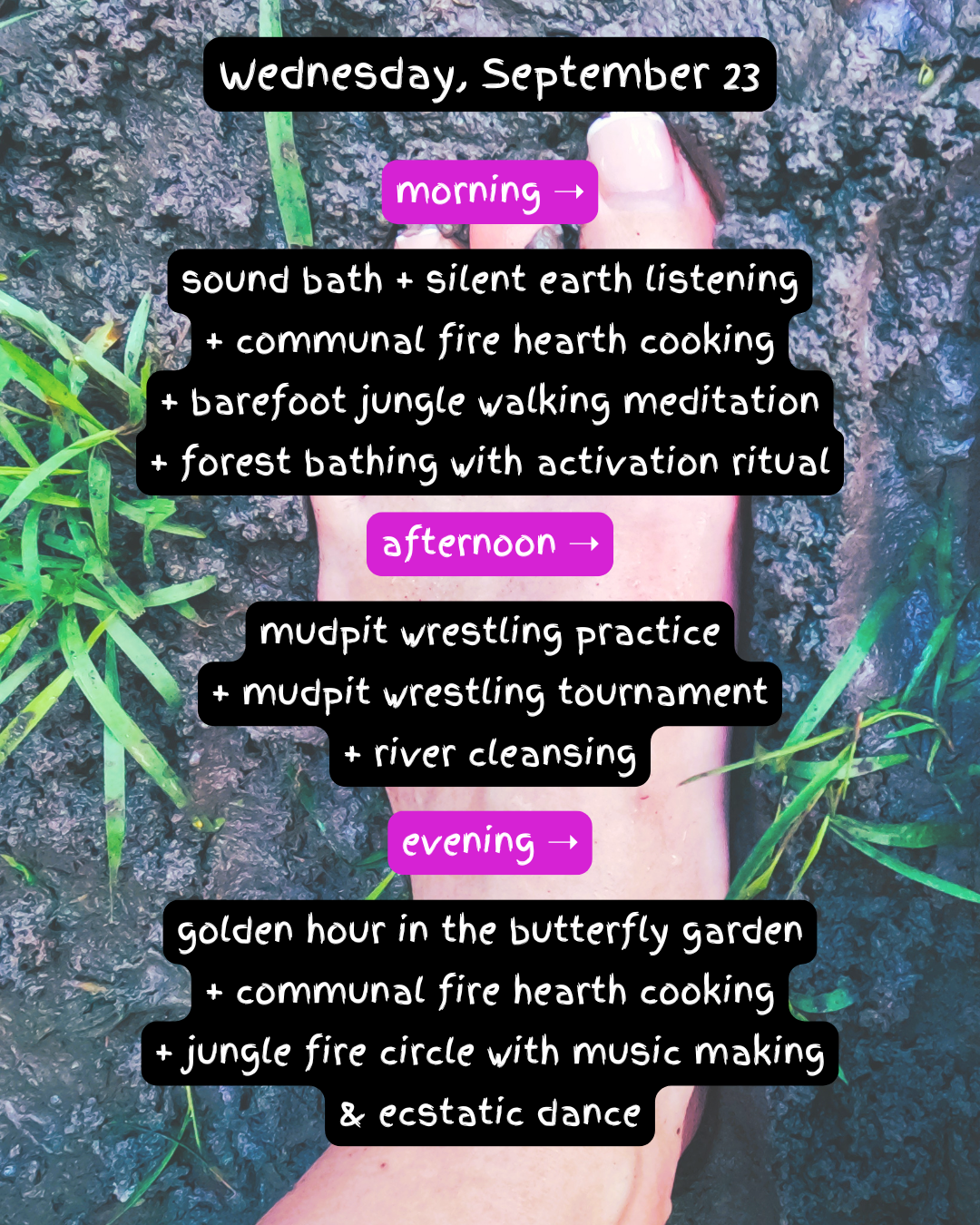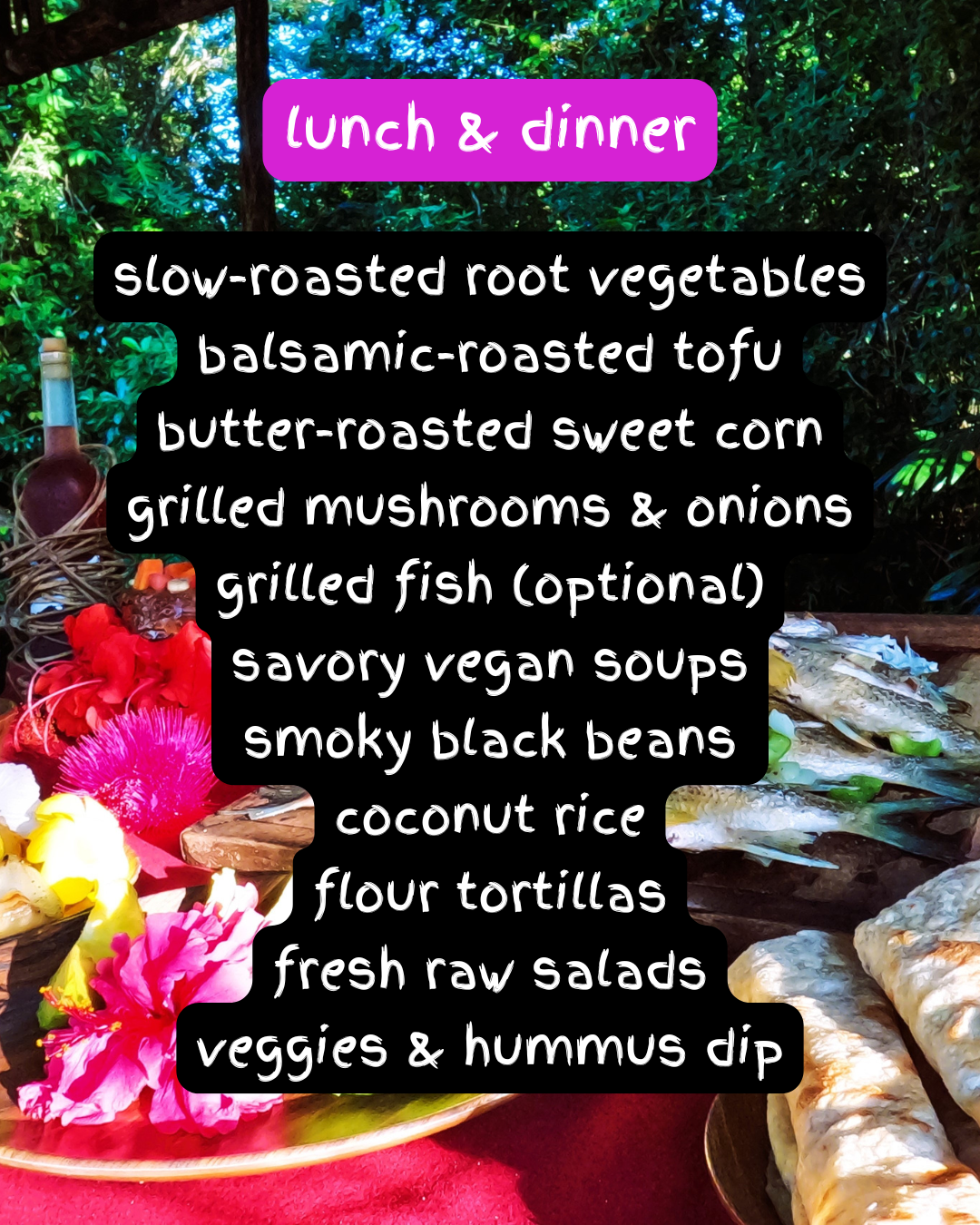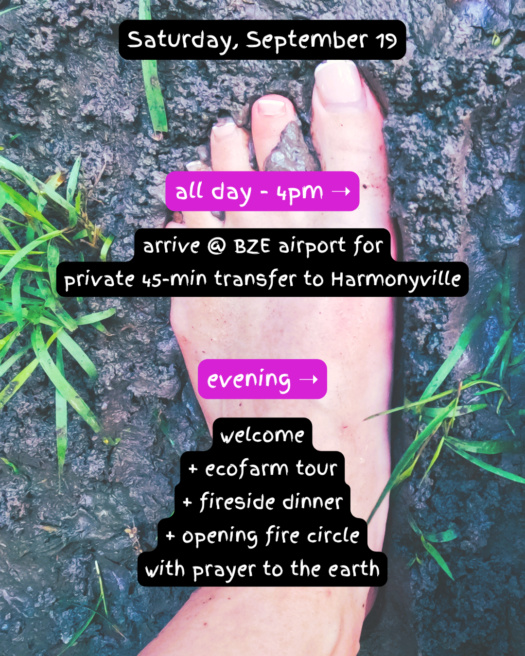 Each blessed day begins with earth listening and a sound bath for the ecofarm. The morning is grounded around communal fire hearth cooking, river swimming, and 60-90 minutes of guided forest bathing.