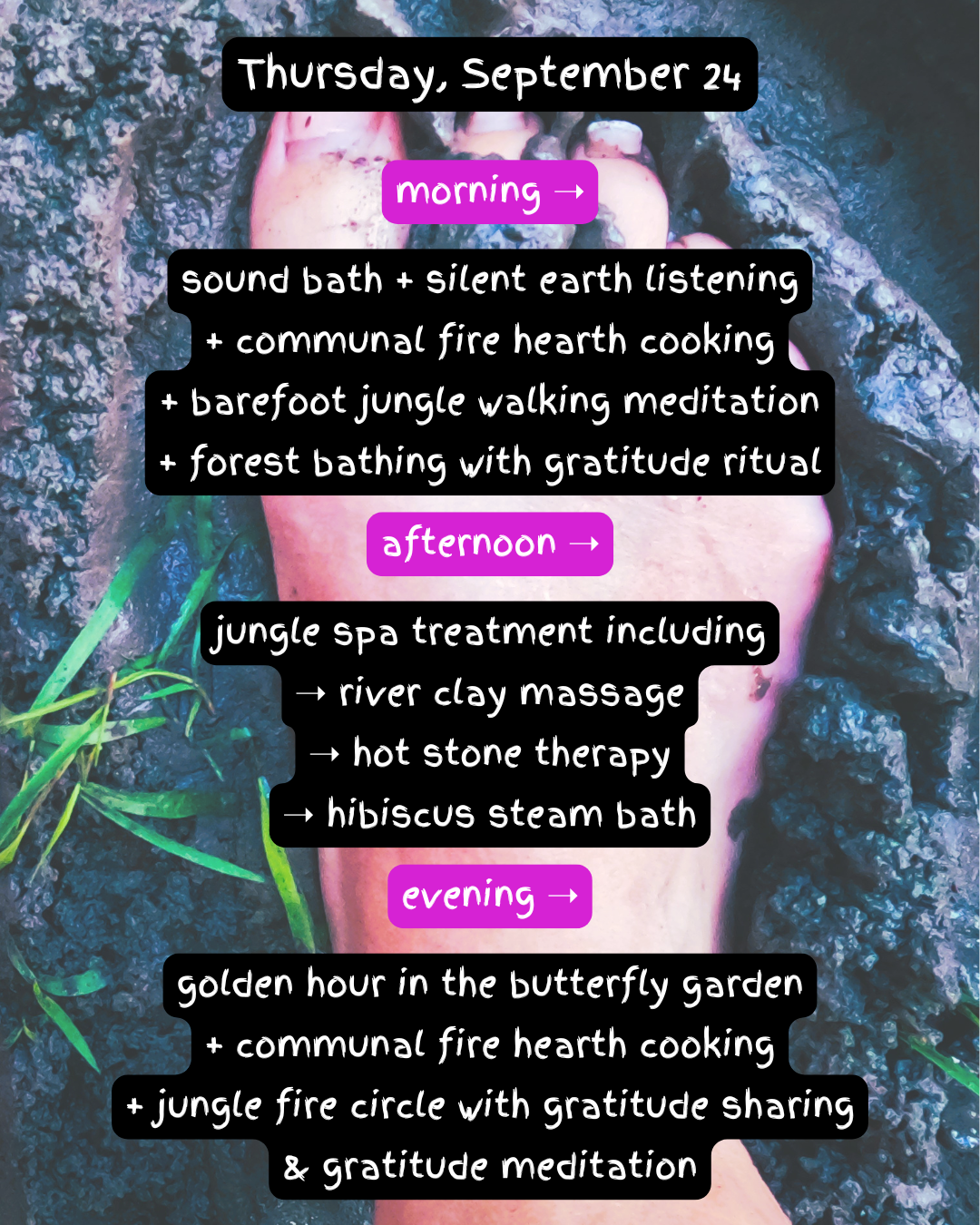 After lunch, we’ll connect intentionally with the earth by engaging in the signature activity for the day. We’ll enjoy the butterfly garden at sunset before grounding around the fire to cook dinner together. The jungle fire circle occurring each evening will feature an earth-based meditation, ceremony, or ritual aligned with the theme of the day.
